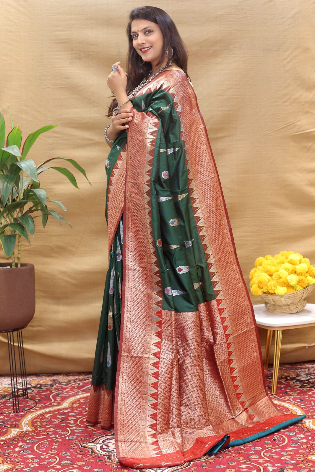 Pretty Dark Green Soft Banarasi Silk Saree With Flaunt Blouse Piece