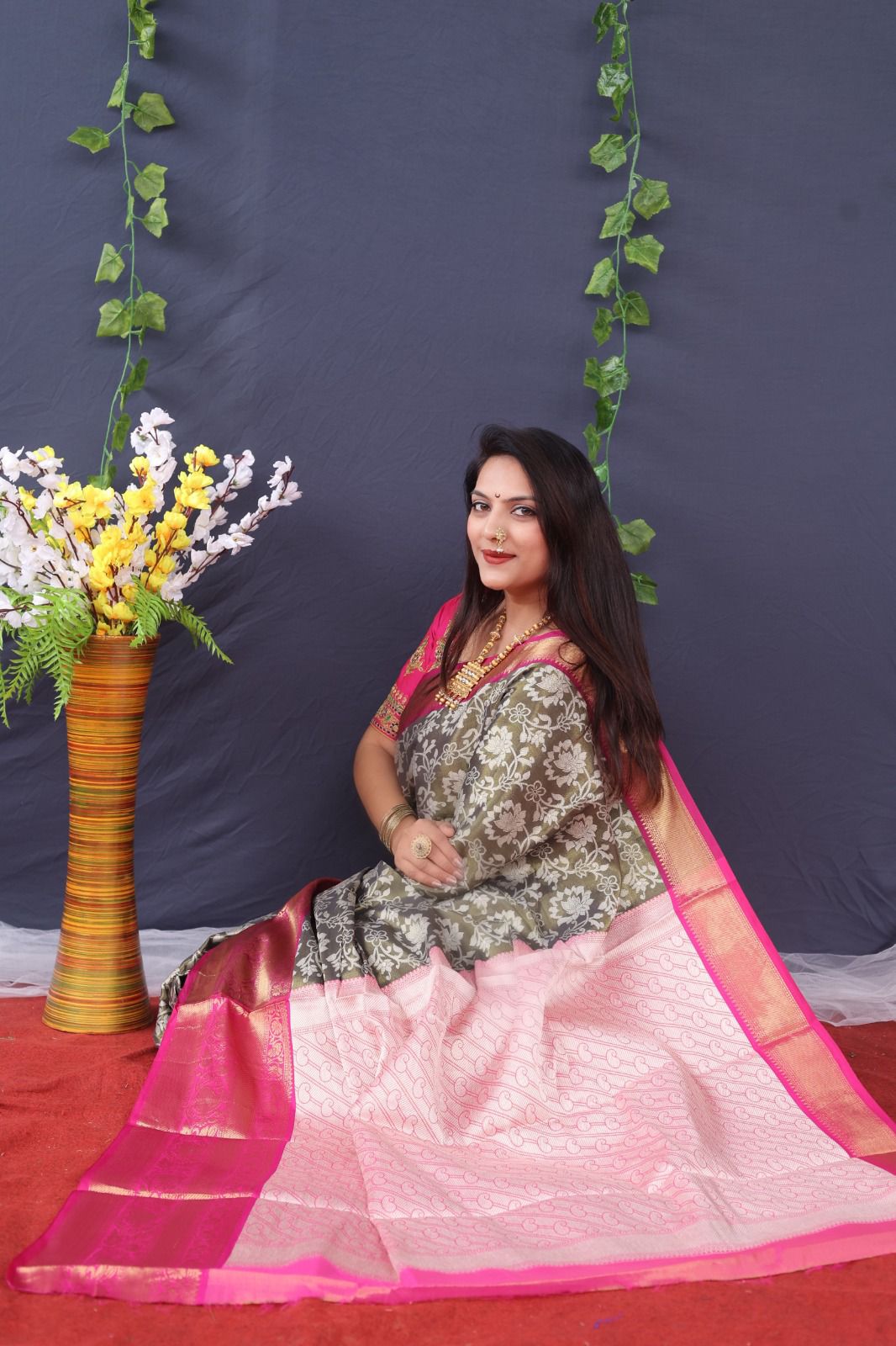 Indulge in pure luxury with our exquisite Kanjivaram silk saree, elaborately handwoven with intricate Zari weaving. The soft, delicate drape of the shimmering fabric complements the rich, ornate patterns, creating a stunning contrast that radiates with opulence. This saree is perfect for a special occasion, and is sure to leave everyone spellbound with its sheer magnificence.