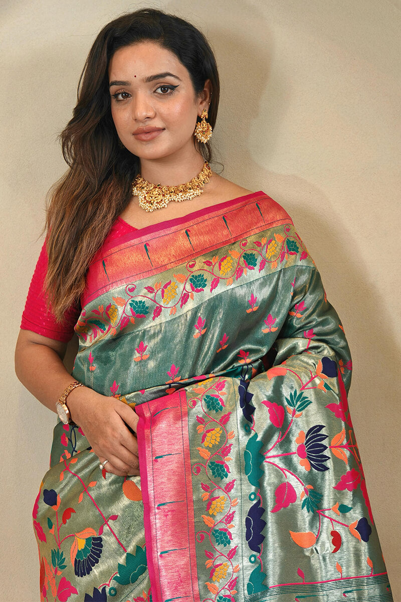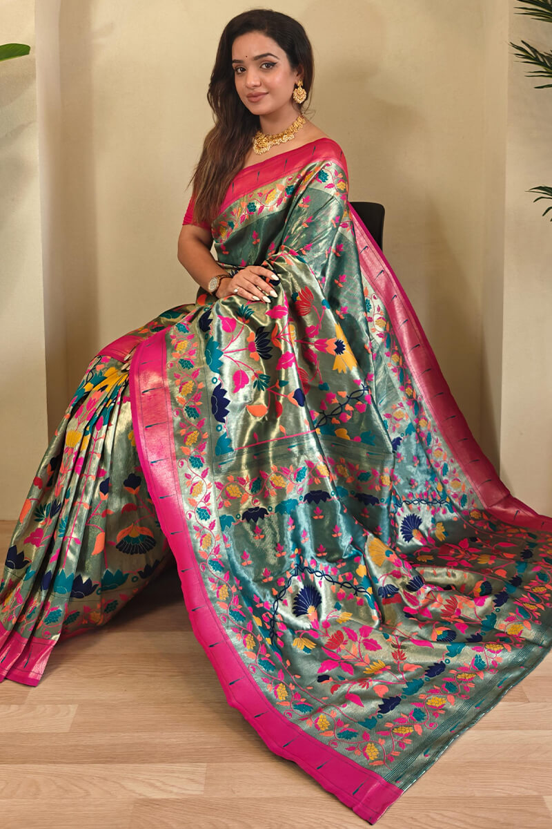 Prominent Rama Paithani Silk Saree With Glorious Blouse Piece