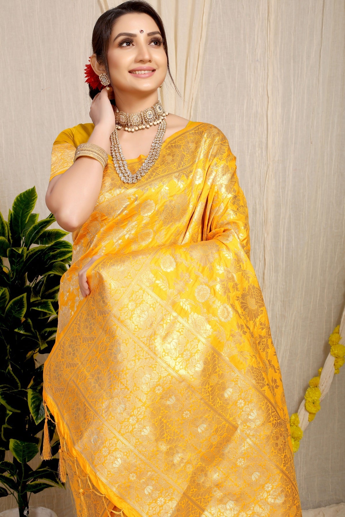 Look classy and chic in this beautiful banarasi saree. Carefully selected designs compliment the overall appeal of the saree. Easy to drape and comfortable to wear, this saree is all about blending style with comfort.