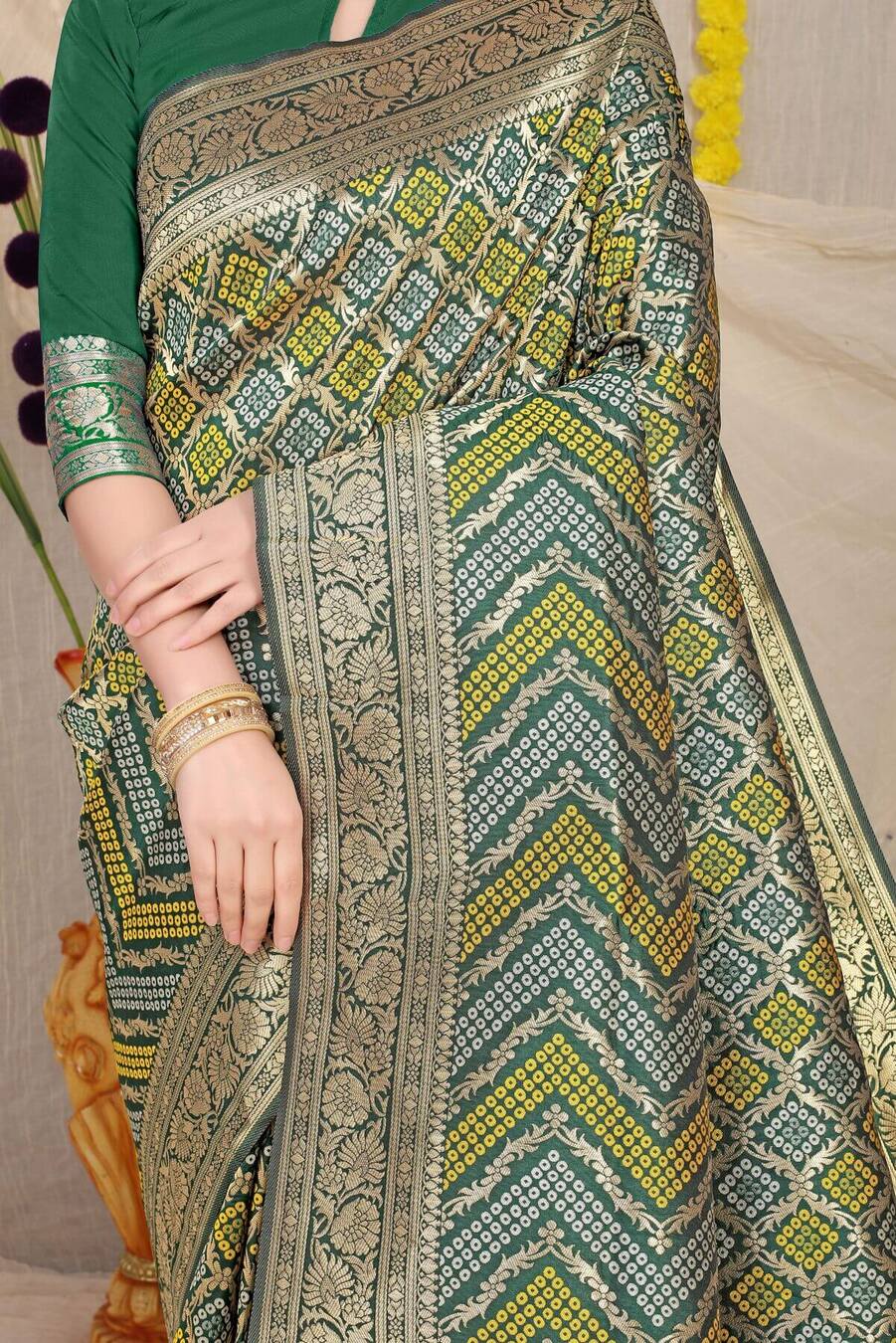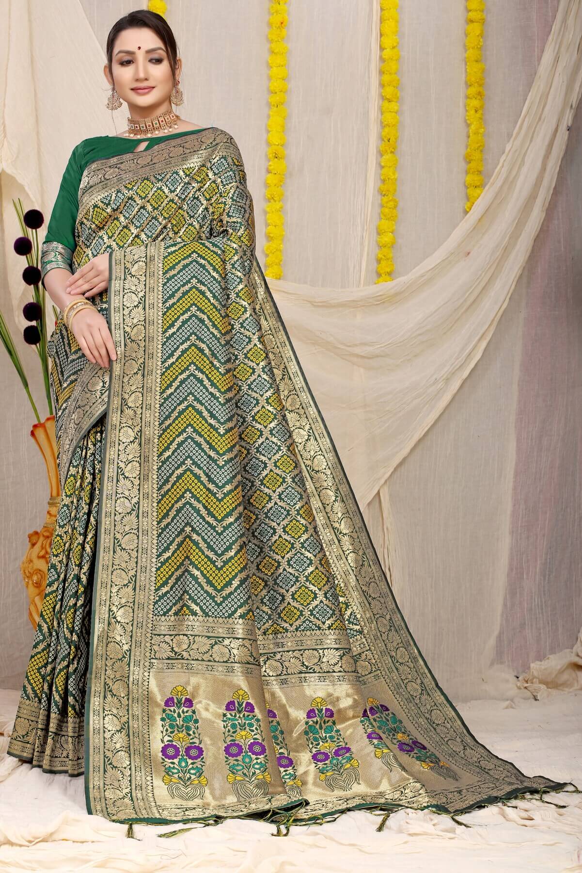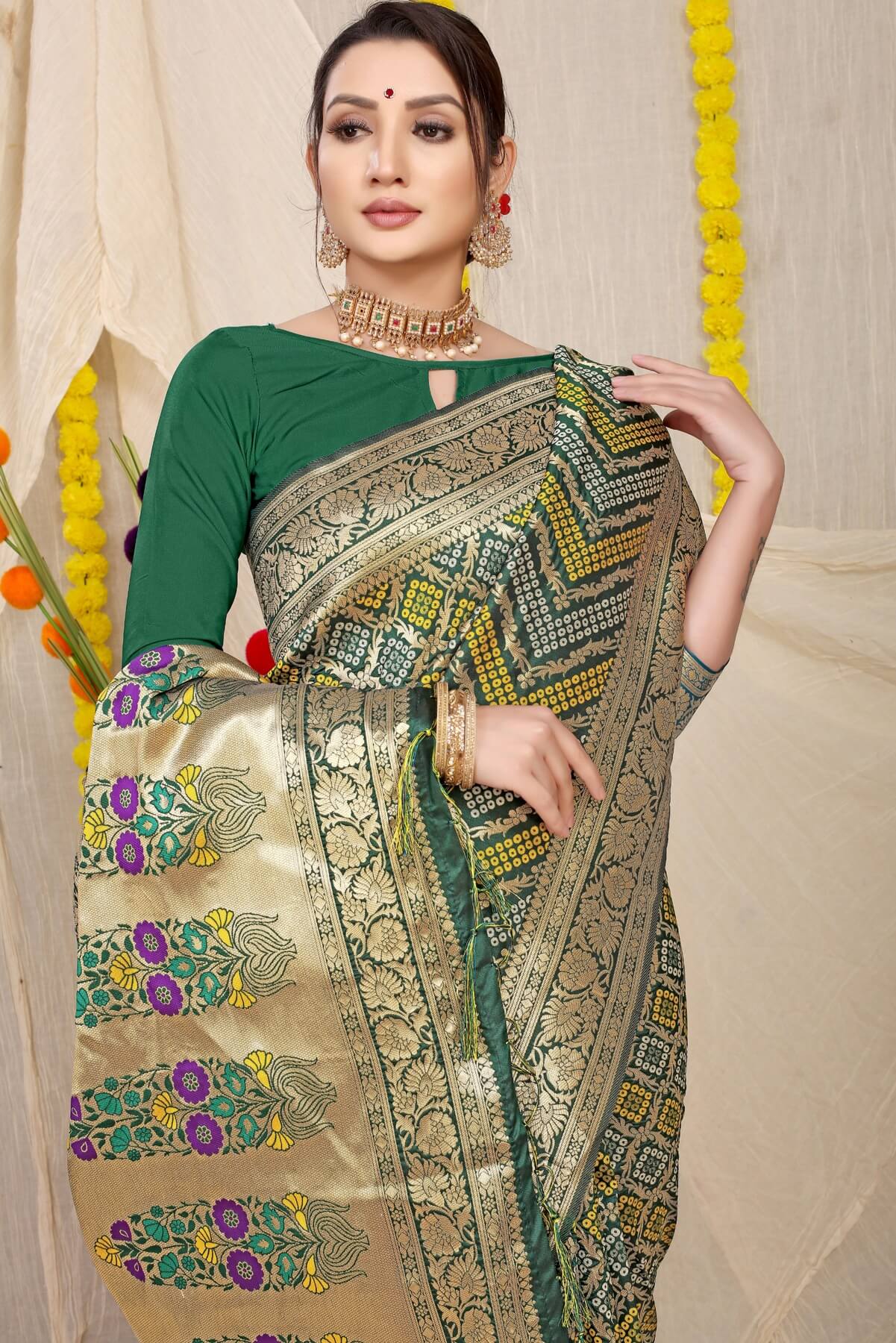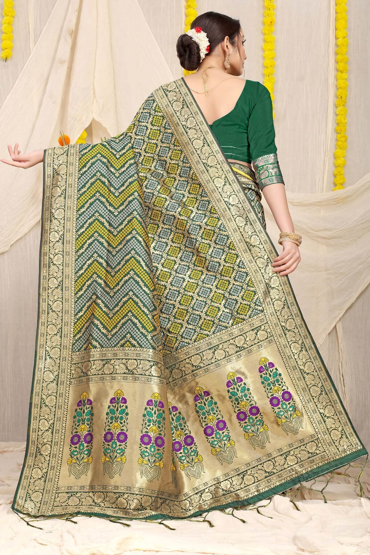 Choose this intriguing Daisy Dark Green Woven Soft Banarasi Silk Saree and strike the perfect note of sartorial symphony. these sarees are soaked in the charm of resplendent colors and fine silk fabric. A complimenting border and motif design make this saree a fascinating piece of art.