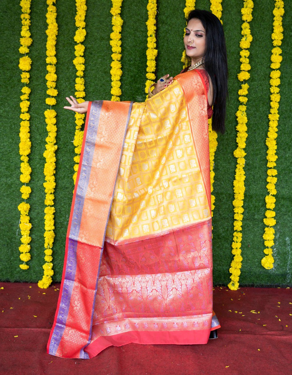 Our Kanjivaram Silks boast modern creativity along with reviving traditional weaving methods. With a magnific look and intricate zari weaving, this drape comes in classic shades with a vibrant golden border. Beautifully crafted with precision and finesse, this beauty blends grace with incessant warmth and charm.