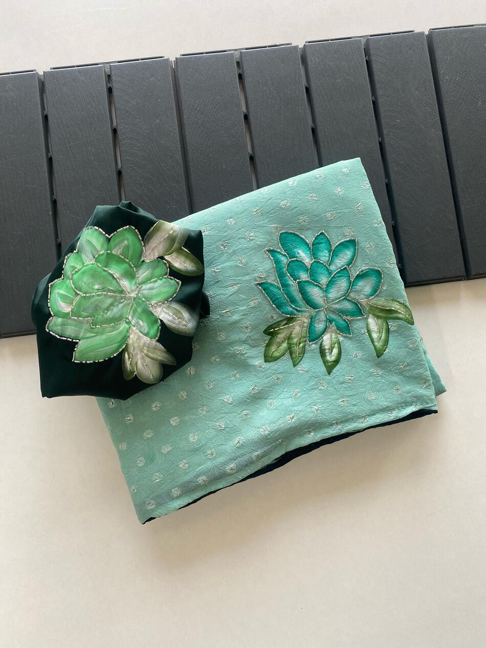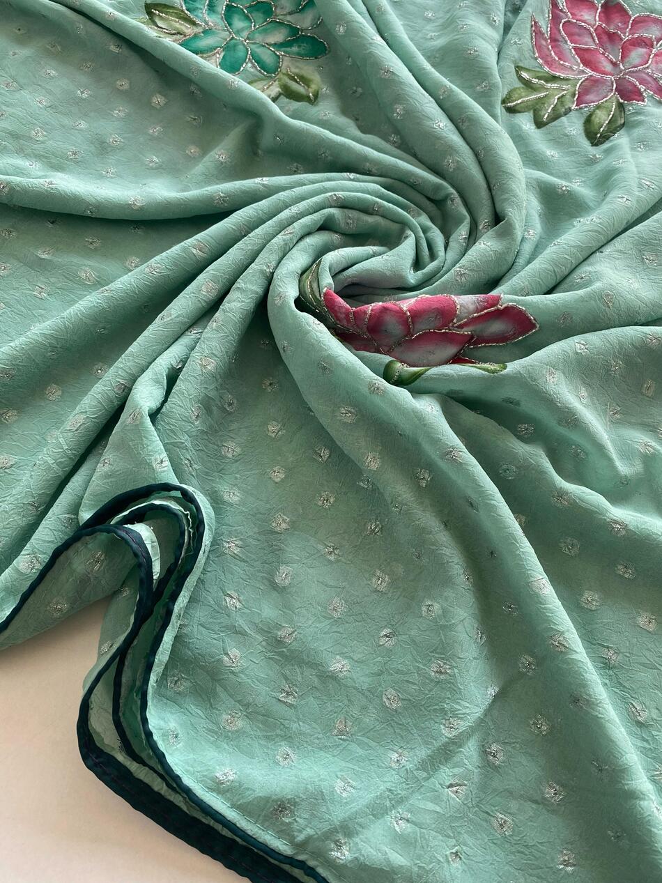 This Handwork Crush Chiffon Silk Saree is a true masterpiece! Made from luxurious chiffon silk, it features intricate handwork embroidery that will make you stand out at any special occasion. The lightweight fabric makes it easy to drape and comfortable to wear all day long. Elevate your ethnic wardrobe with this stunning saree.