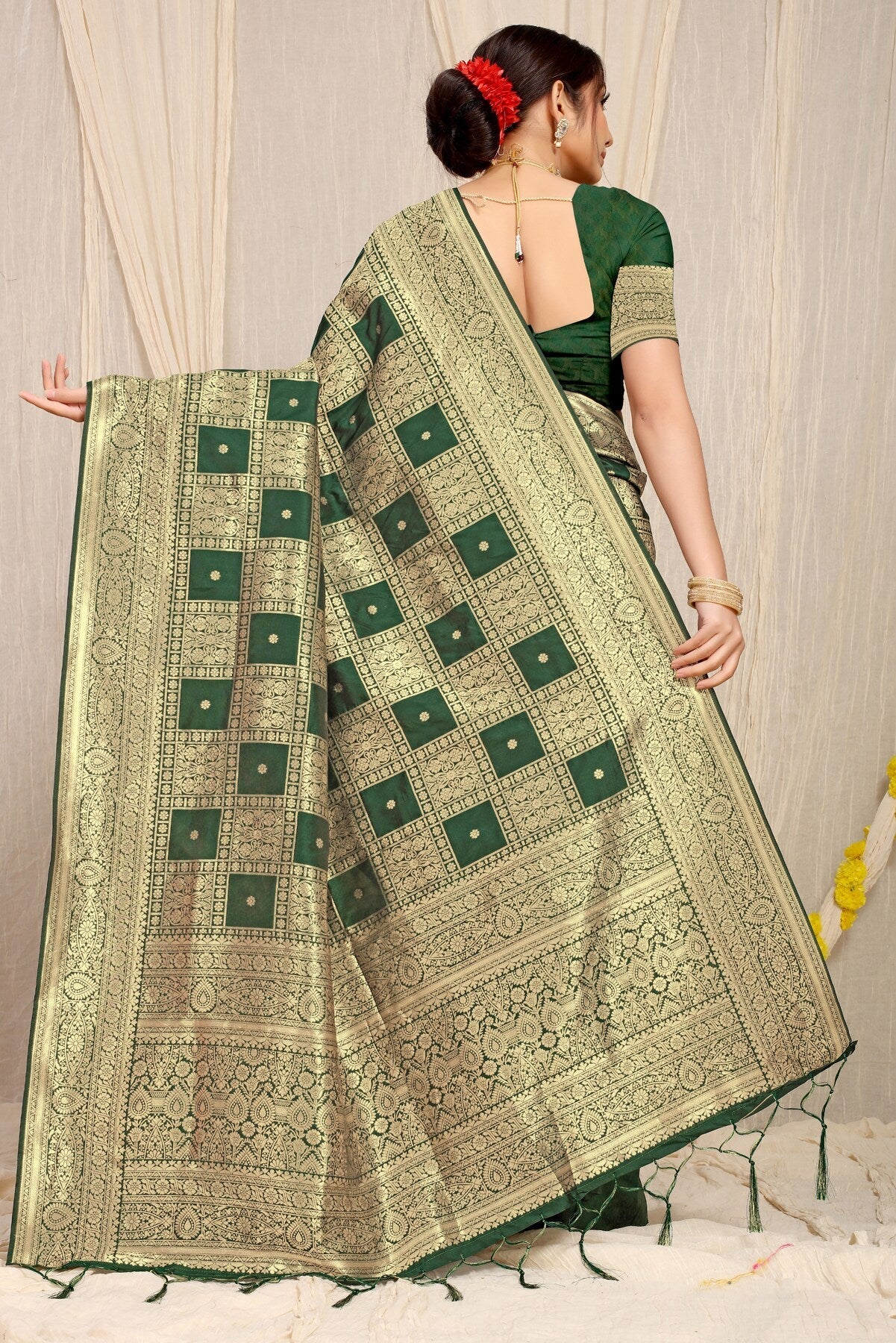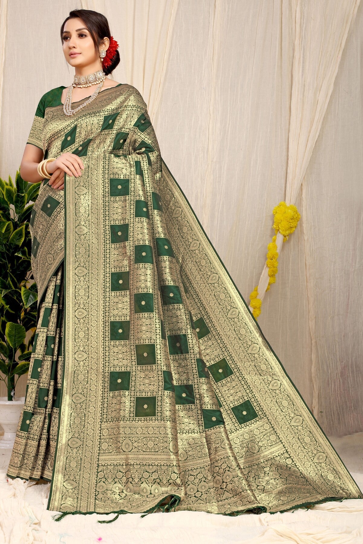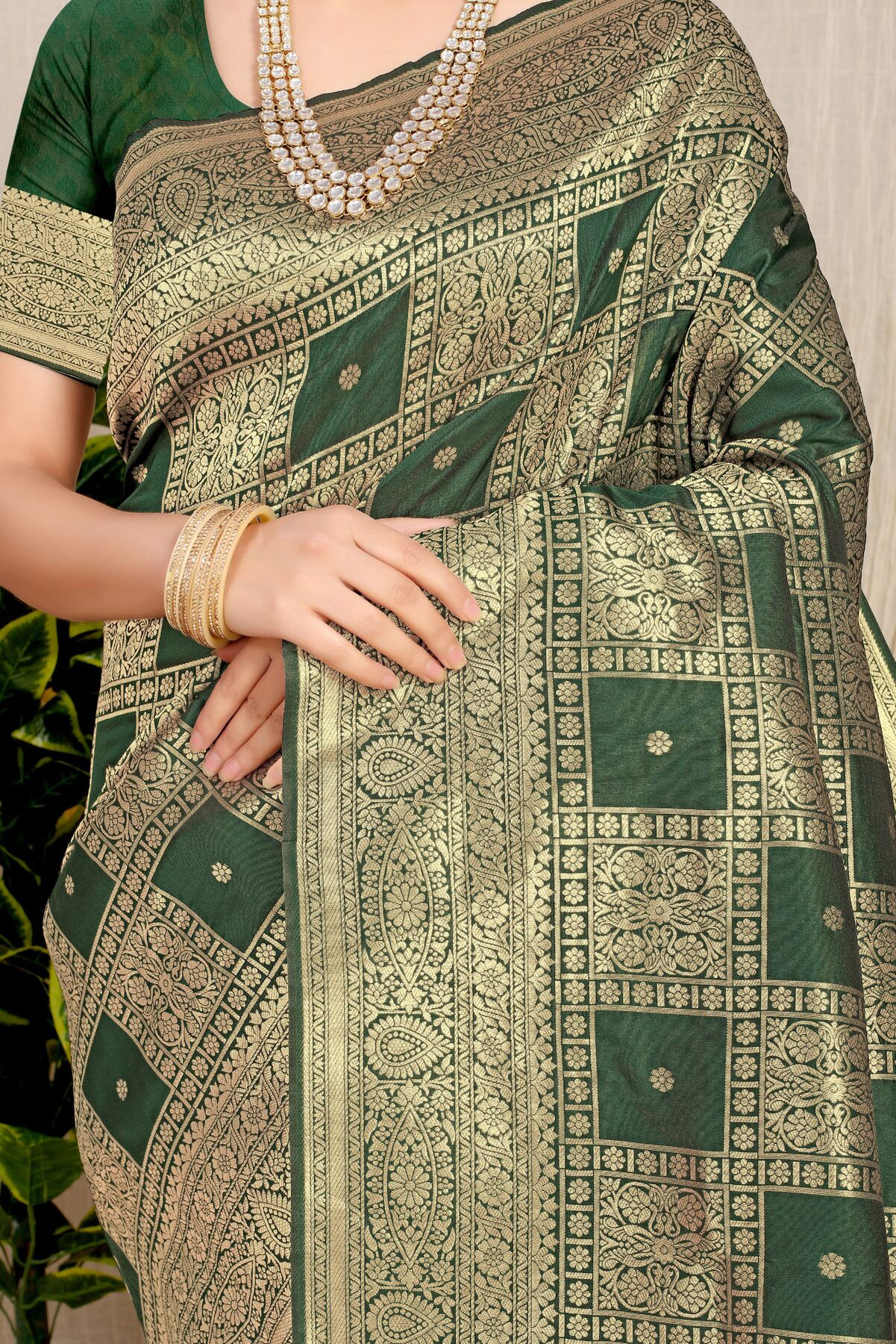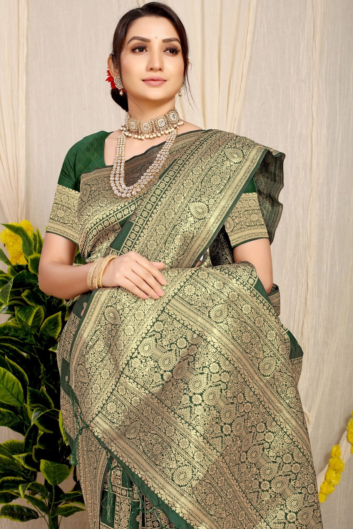 Sizzling Dark Green Kanjivaram Silk Saree With Glittering Blouse Piece