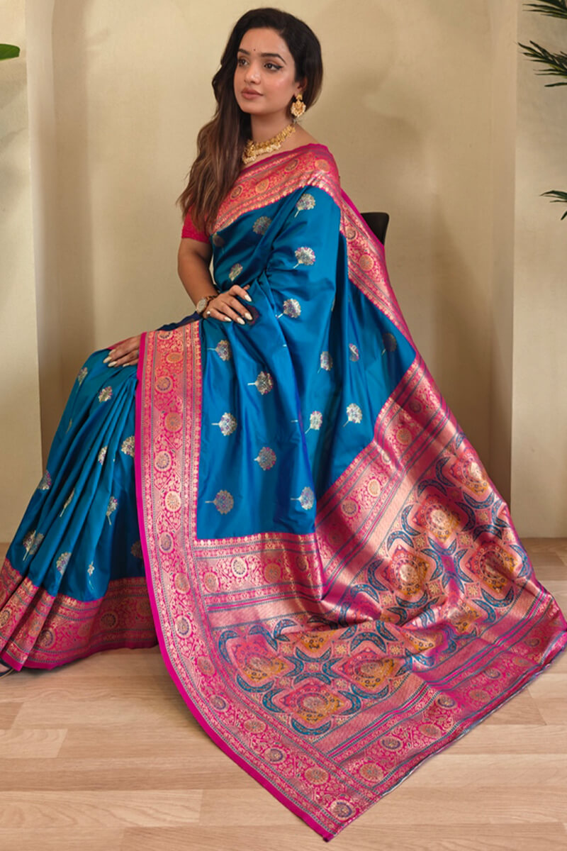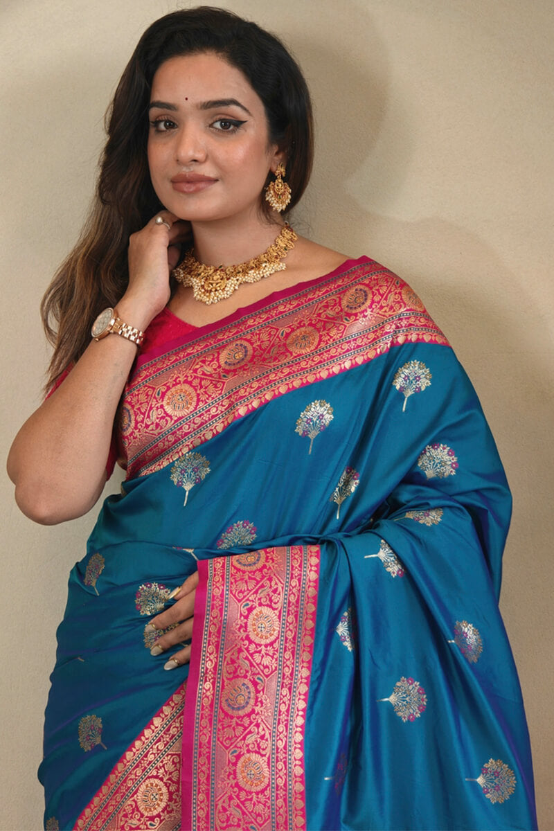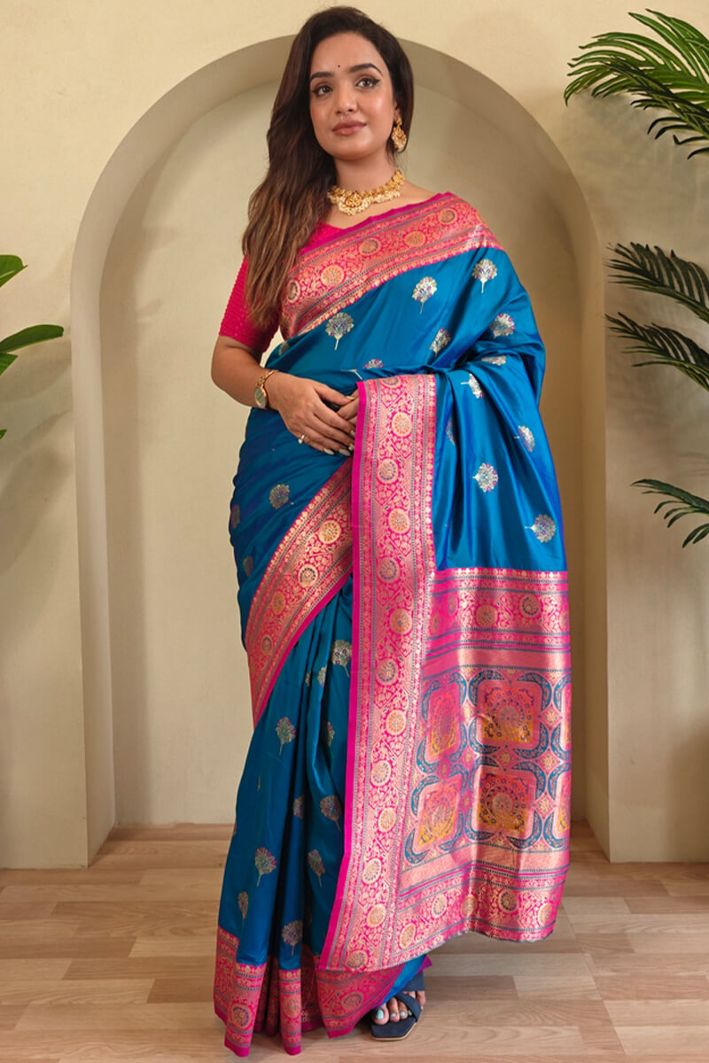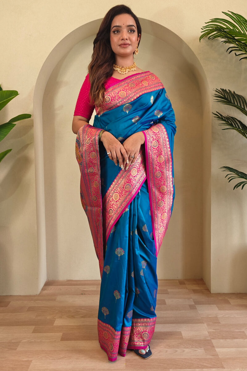 Skinny Blue Soft Banarasi Silk Saree With Deserving Blouse Piece