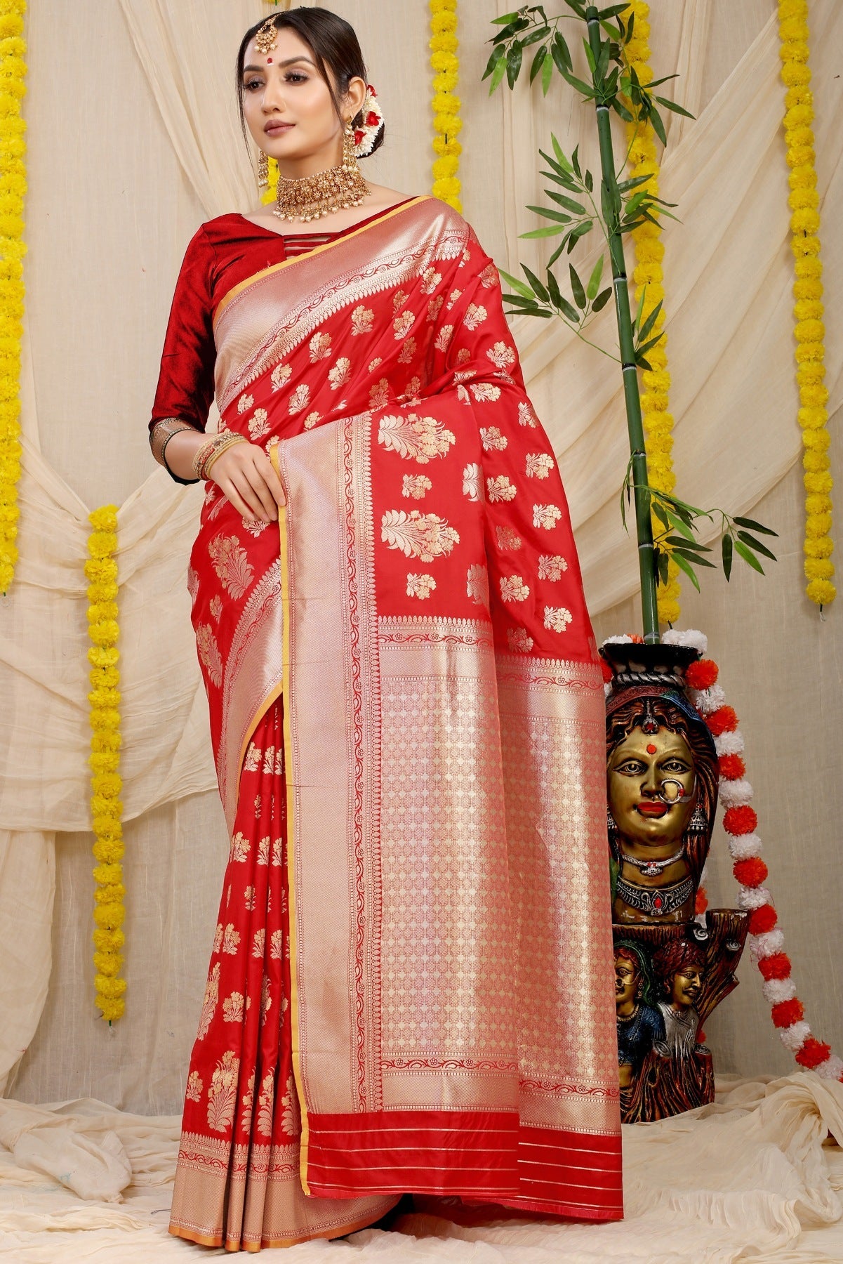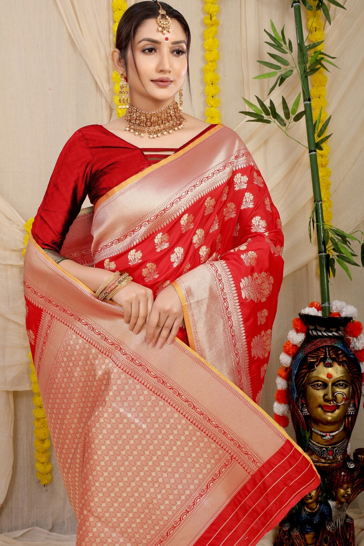 BLOUSE SPECIFICATION: Fabric: Kanjivaram Silk Colour: Red Work Type: Jacquard Weaving Stitching Type: Unstitched