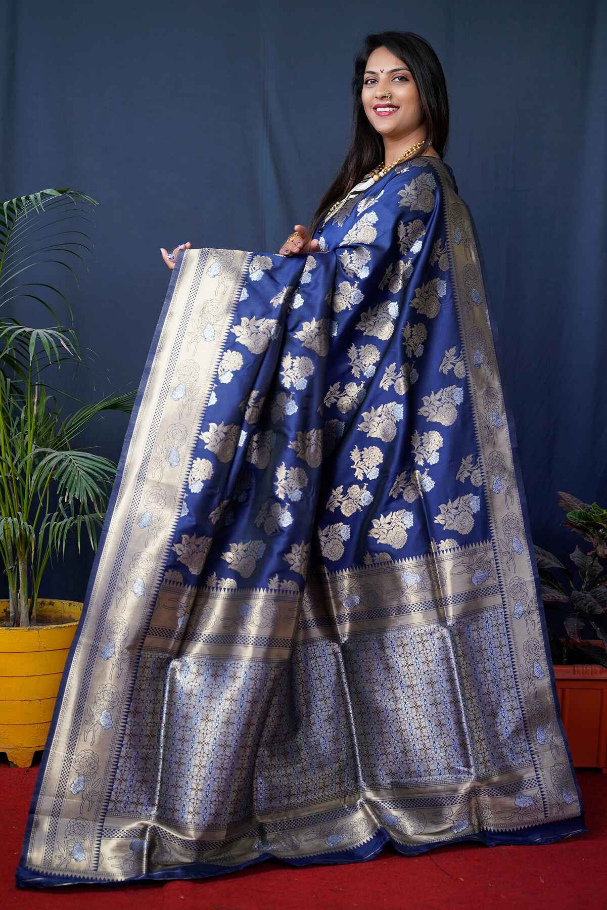 BLOUSE SPECIFICATION: Fabric: Kanjivaram Silk Colour: Navy Blue Work Type: Jacquard Weaving Stitching Type: Unstitched