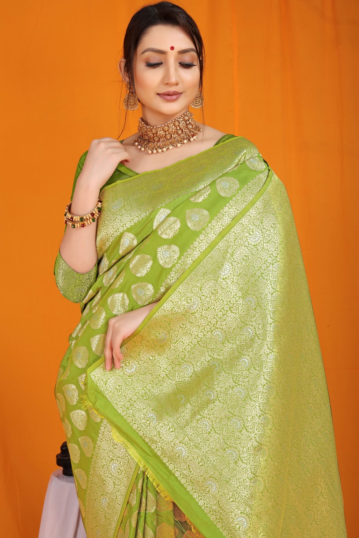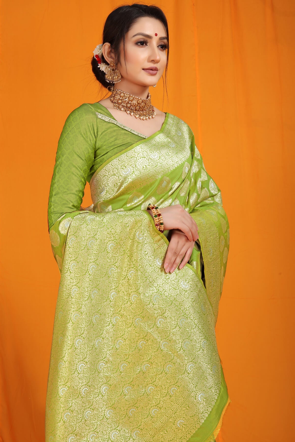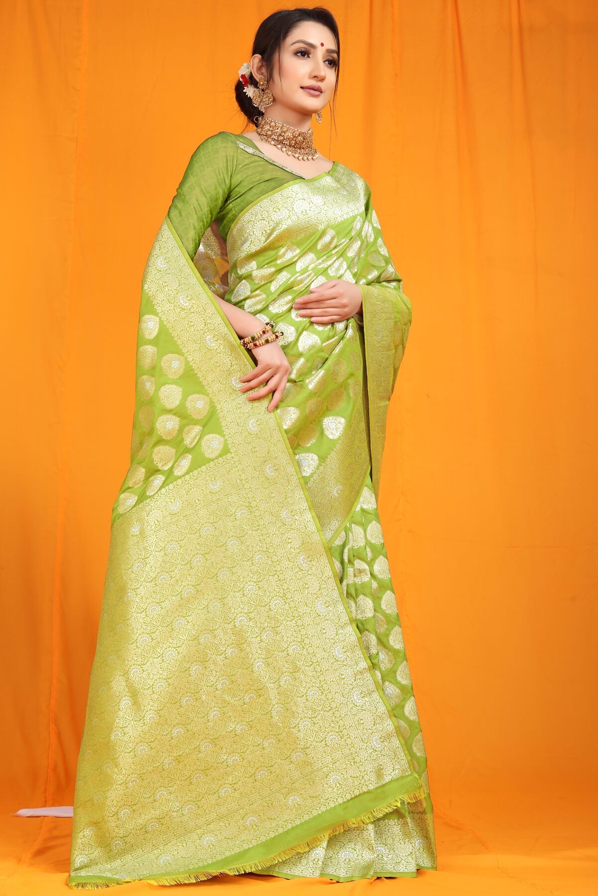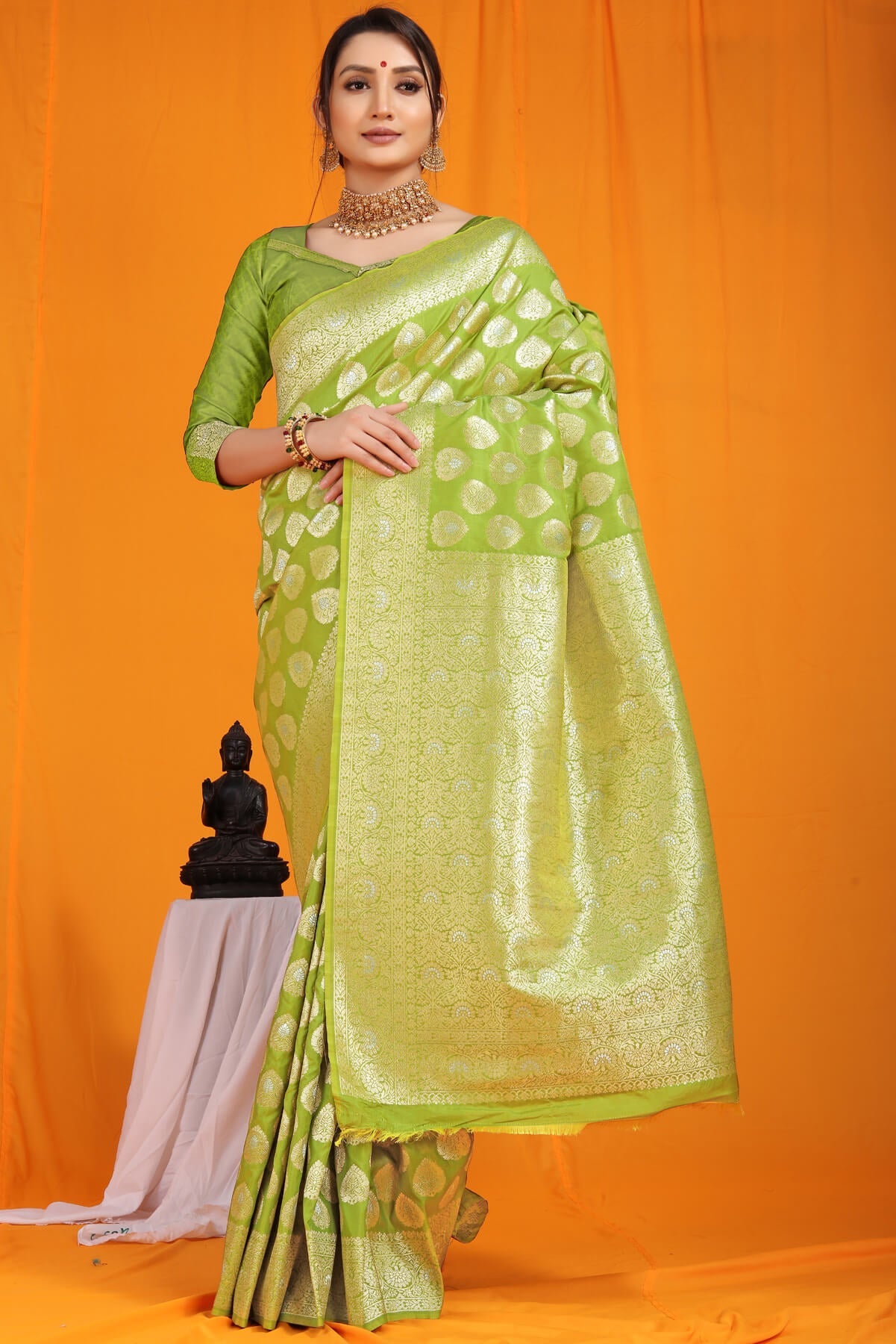 Be an angel and create and establish a smashing influence on everybody by carrying this traditional Banarasi saree. This saree is crafted by skilled weaver of Banaras with elegance and grace, this saree is definitely the epitome of beauty and a must have in your collection. Style it with your best pair of heels, gold or Moti necklace and a potli bag for the perfect look.