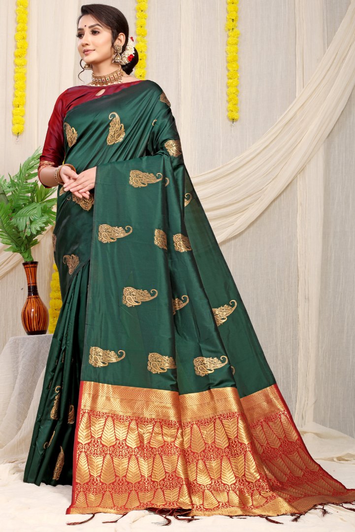 Go ethnic this festival season wearing this demandin saree is crafted on Banarasi silk fabric and beautified with amazing border. Saree paired with Banarasi silk fabric unstitched blouse piece which can be stitched as per your requirement. This saree would surely attract you showers of compliments when you wear it for parties, functions or occasions, where you want to be center of attraction. Pair it with ethnic accessories to make the look more outstanding. This saree won't fail to impress everyone around you.