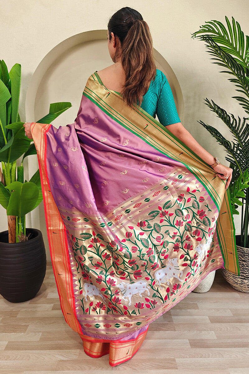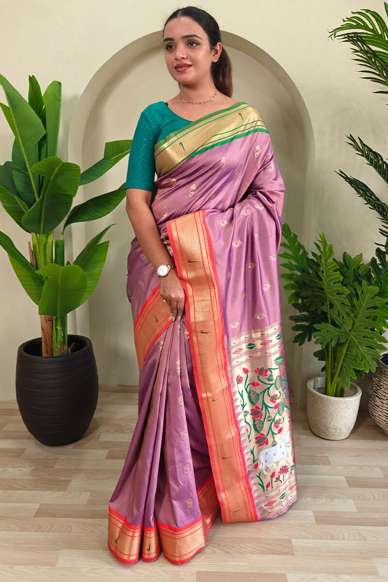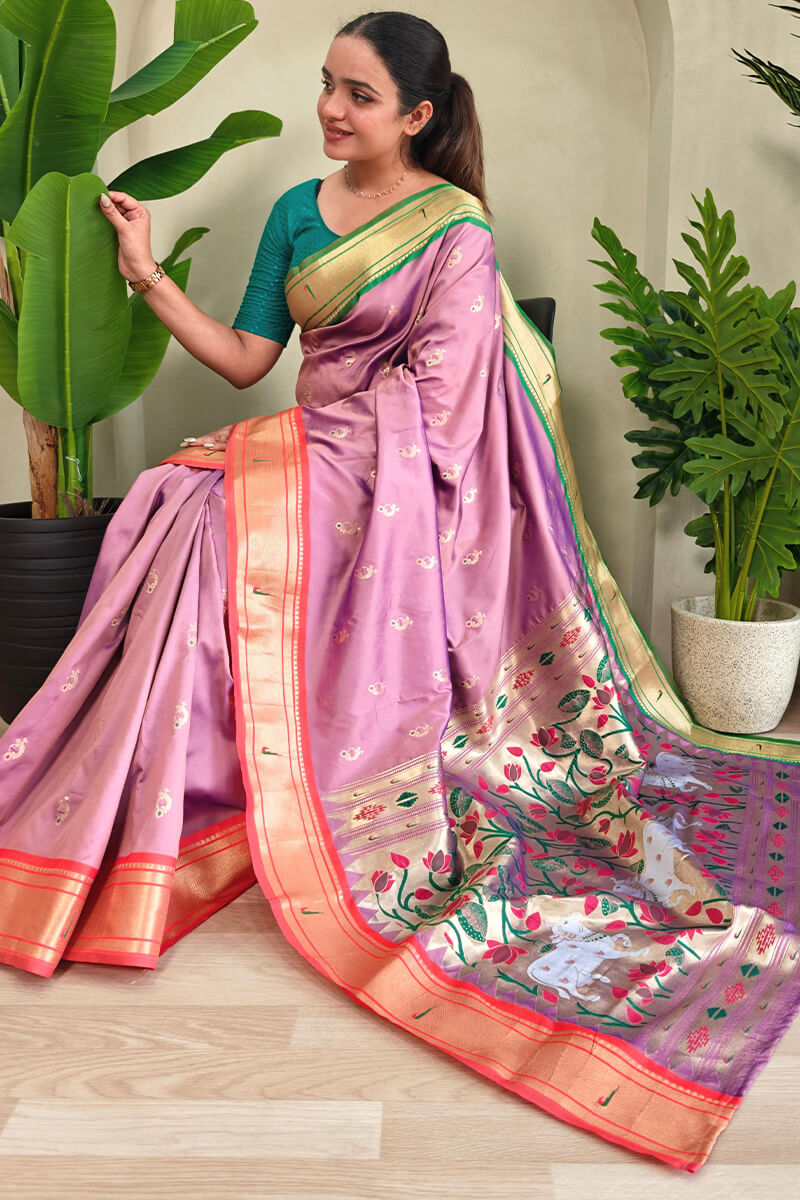 Stylish Baby Pink Paithani Silk Saree With Imaginative Blouse Piece