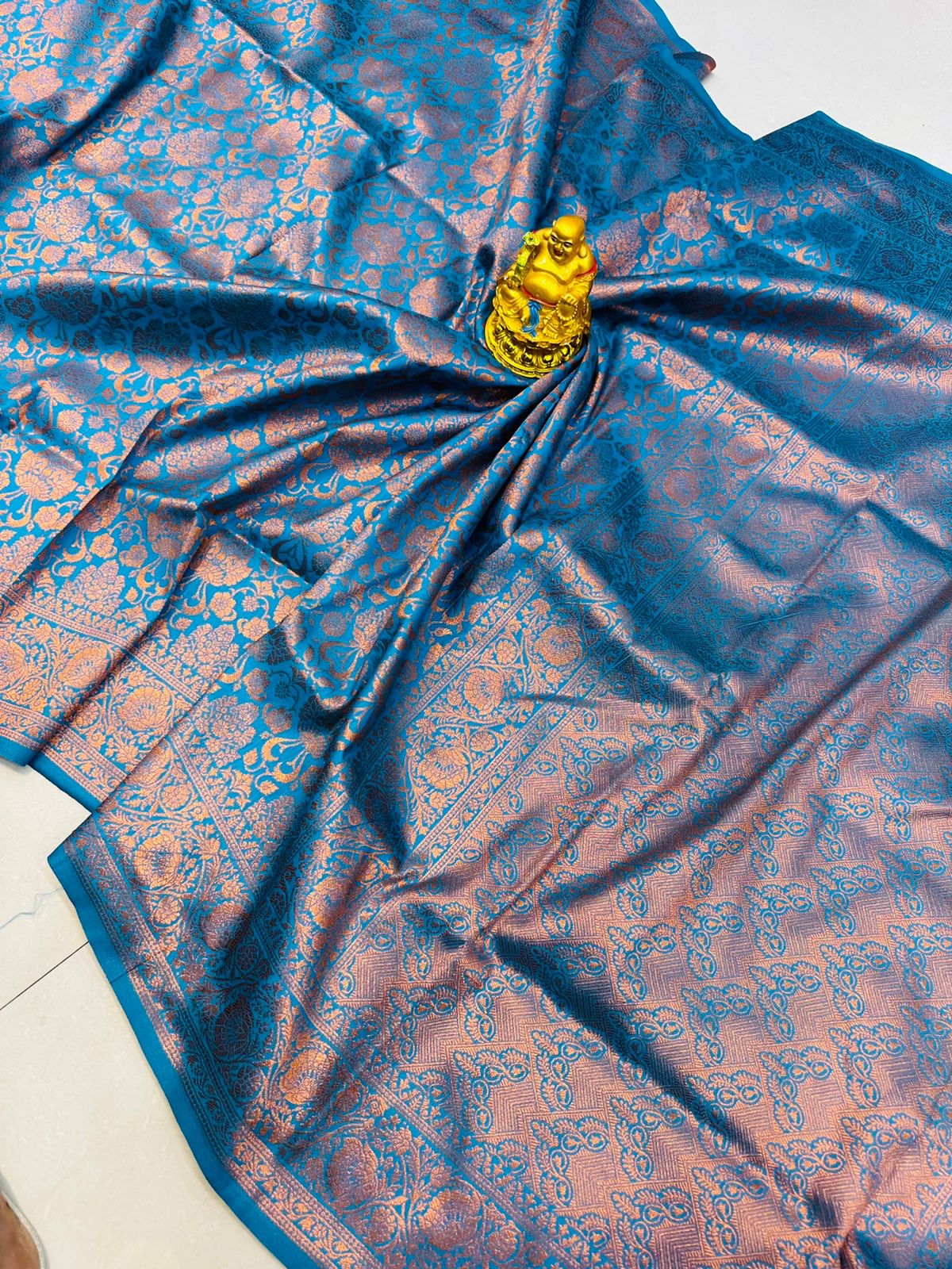 Stylish Firozi Kanjivaram Silk Saree With Outstanding Blouse Piece