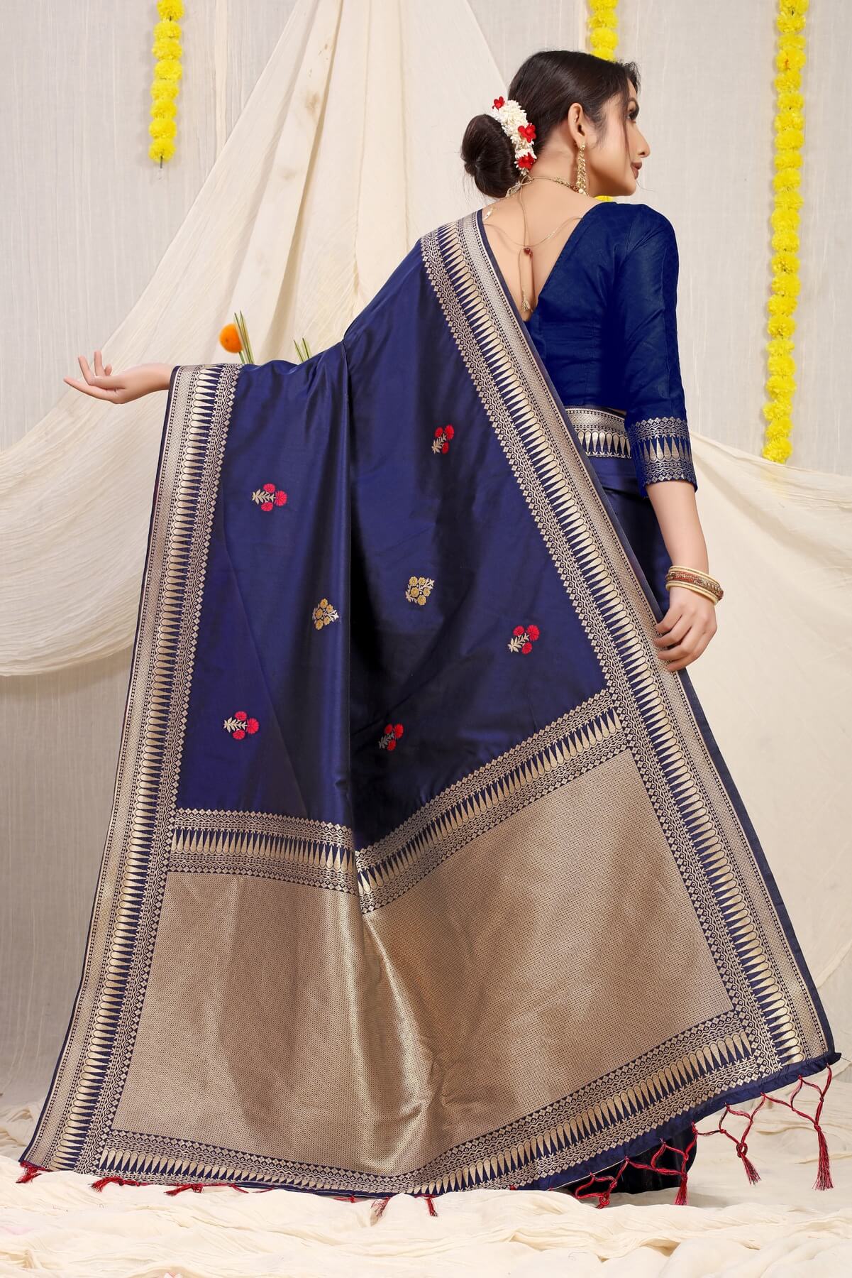 Stylish Navy Blue Banarasi Silk Saree With Magnetic Blouse Piece