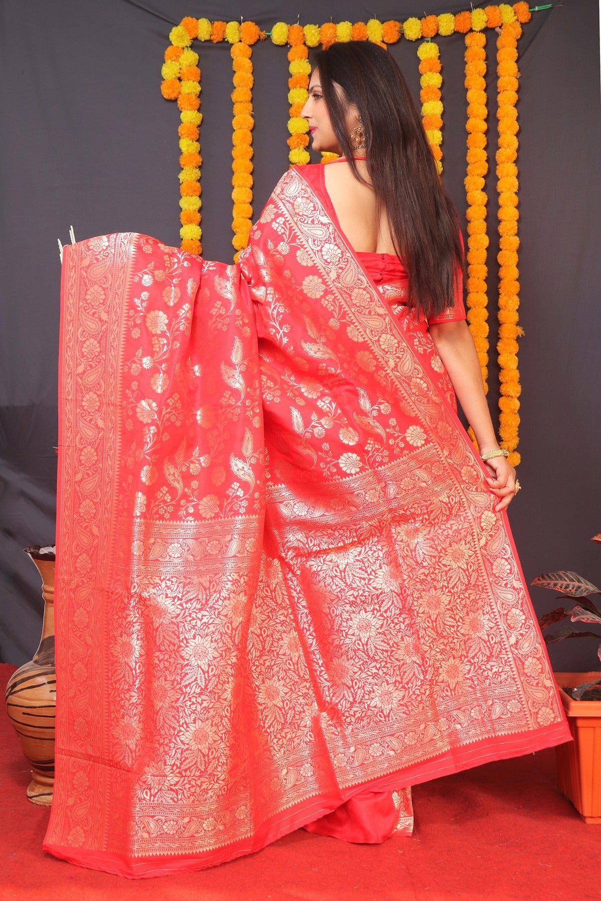 Bringing the best of the traditions on a saree, this piece is composed of poise and elegance. With carefully selected designs and rich border, no wardrobe is complete without this saree.