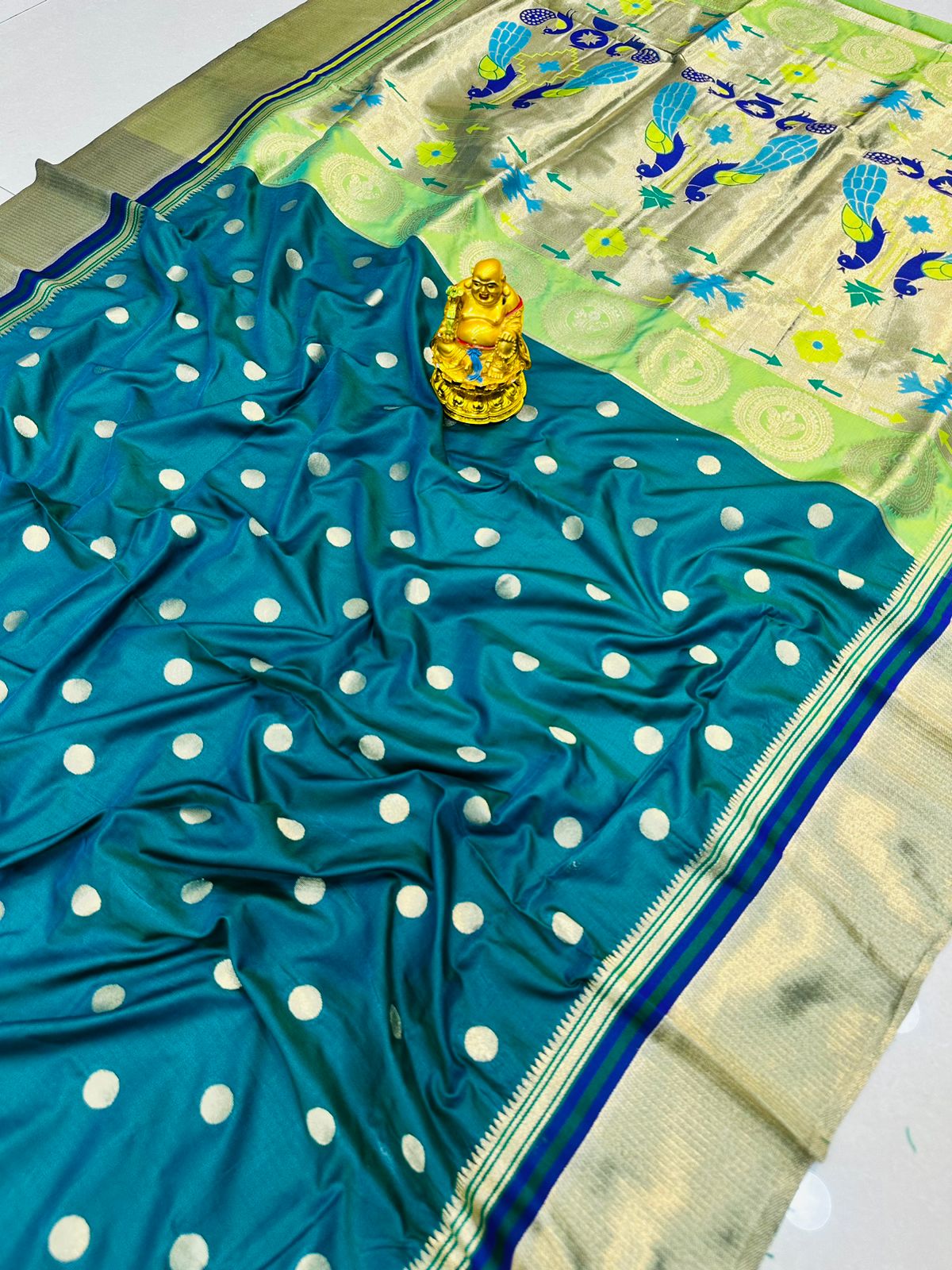 Traditional Rama Paithani Silk Saree With Demure Blouse Piece