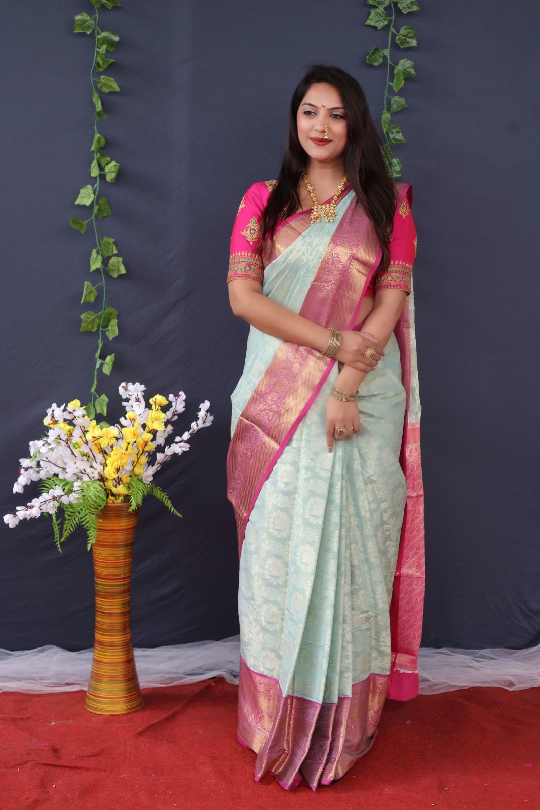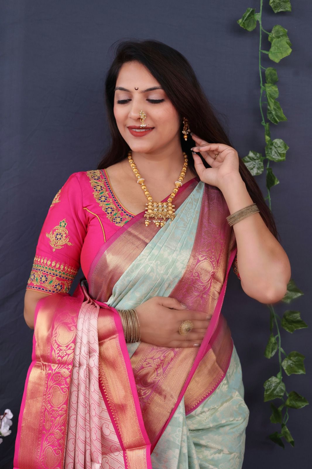 Indulge in pure luxury with our exquisite Kanjivaram silk saree, elaborately handwoven with intricate Zari weaving. The soft, delicate drape of the shimmering fabric complements the rich, ornate patterns, creating a stunning contrast that radiates with opulence. This saree is perfect for a special occasion, and is sure to leave everyone spellbound with its sheer magnificence.