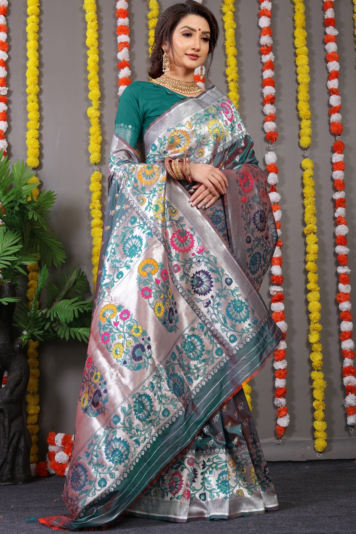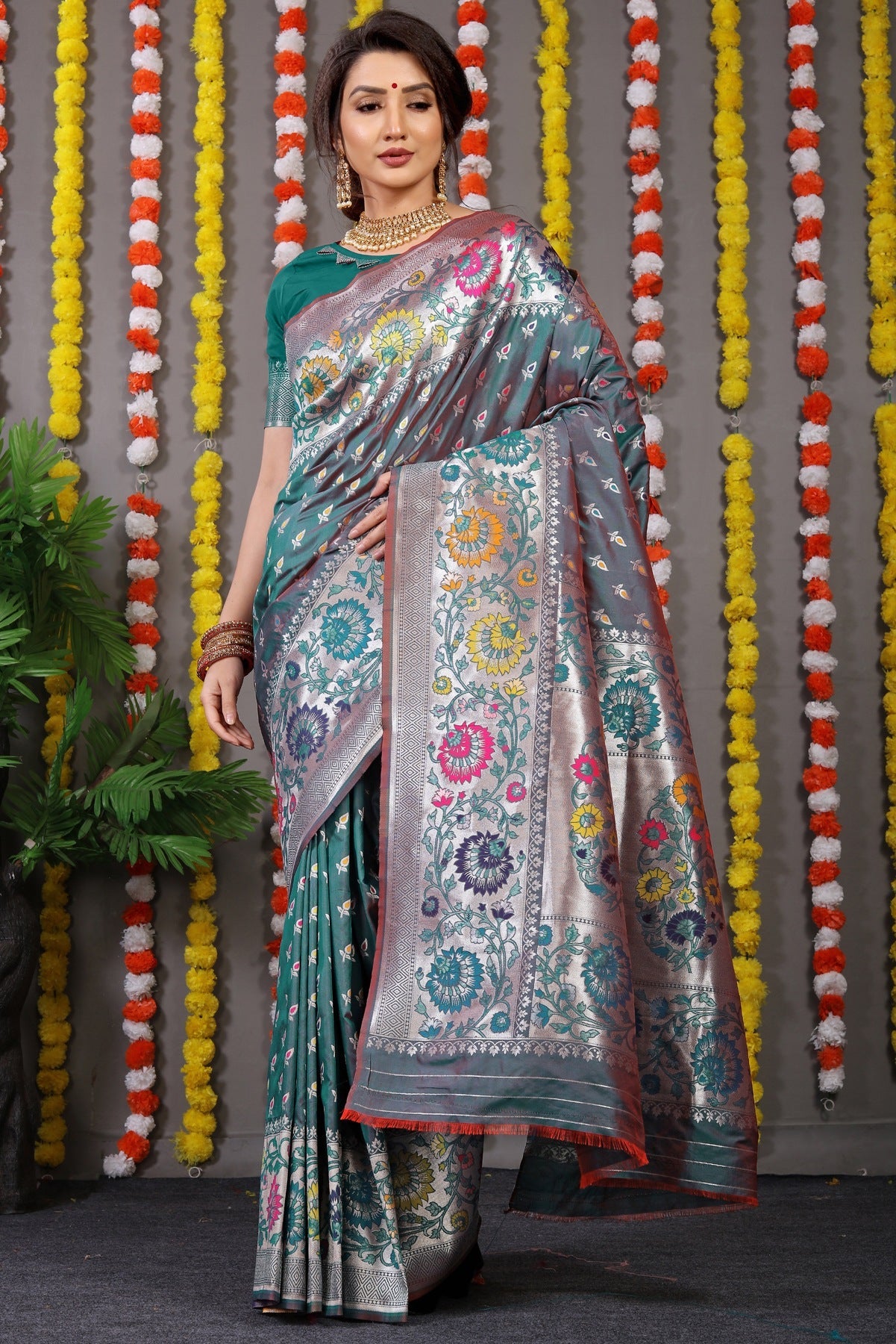 Newly launched Banarasi Silk Sarees comes with designer blouse piece. Saree has exquisite zari weaved border & embellished with hand work. Saree comes with designer silk blouse piece.