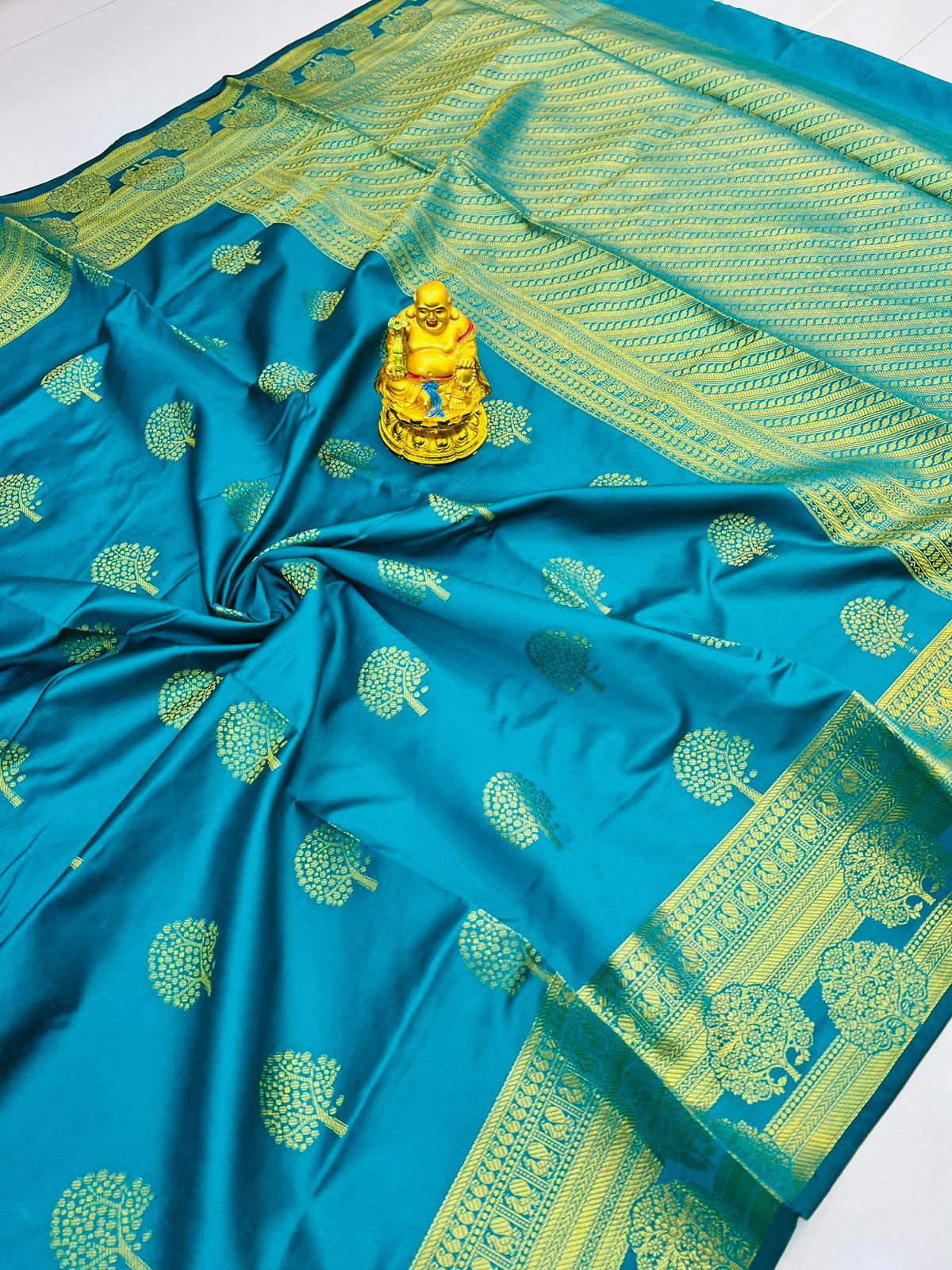 You will find it hard to say no to the resplendent appeal of the colour combination and to the dancing motif in pure Banarasi silk saree which is like a match made in heaven and has a magical powers to make you look like a royalty in seconds.
